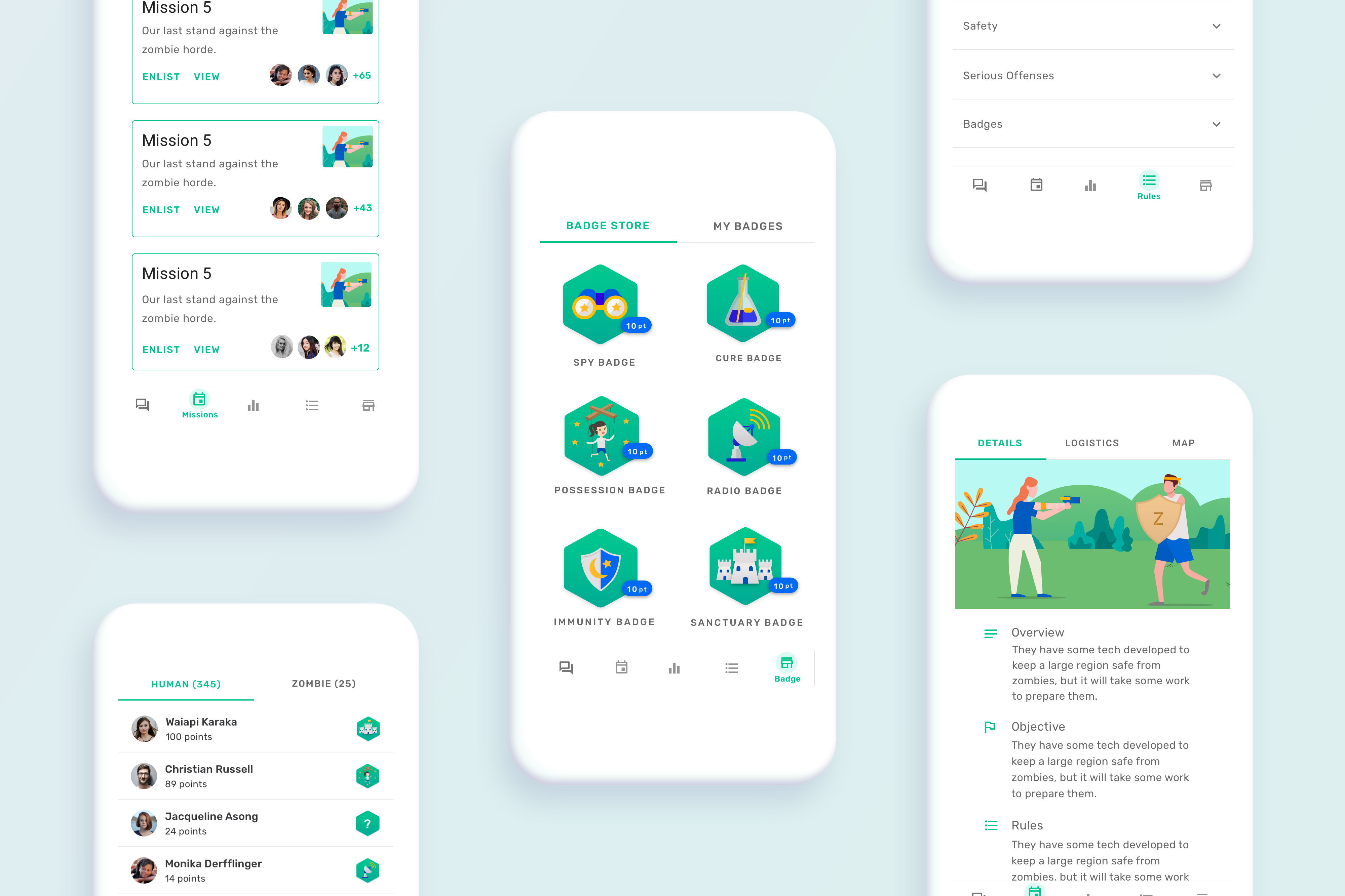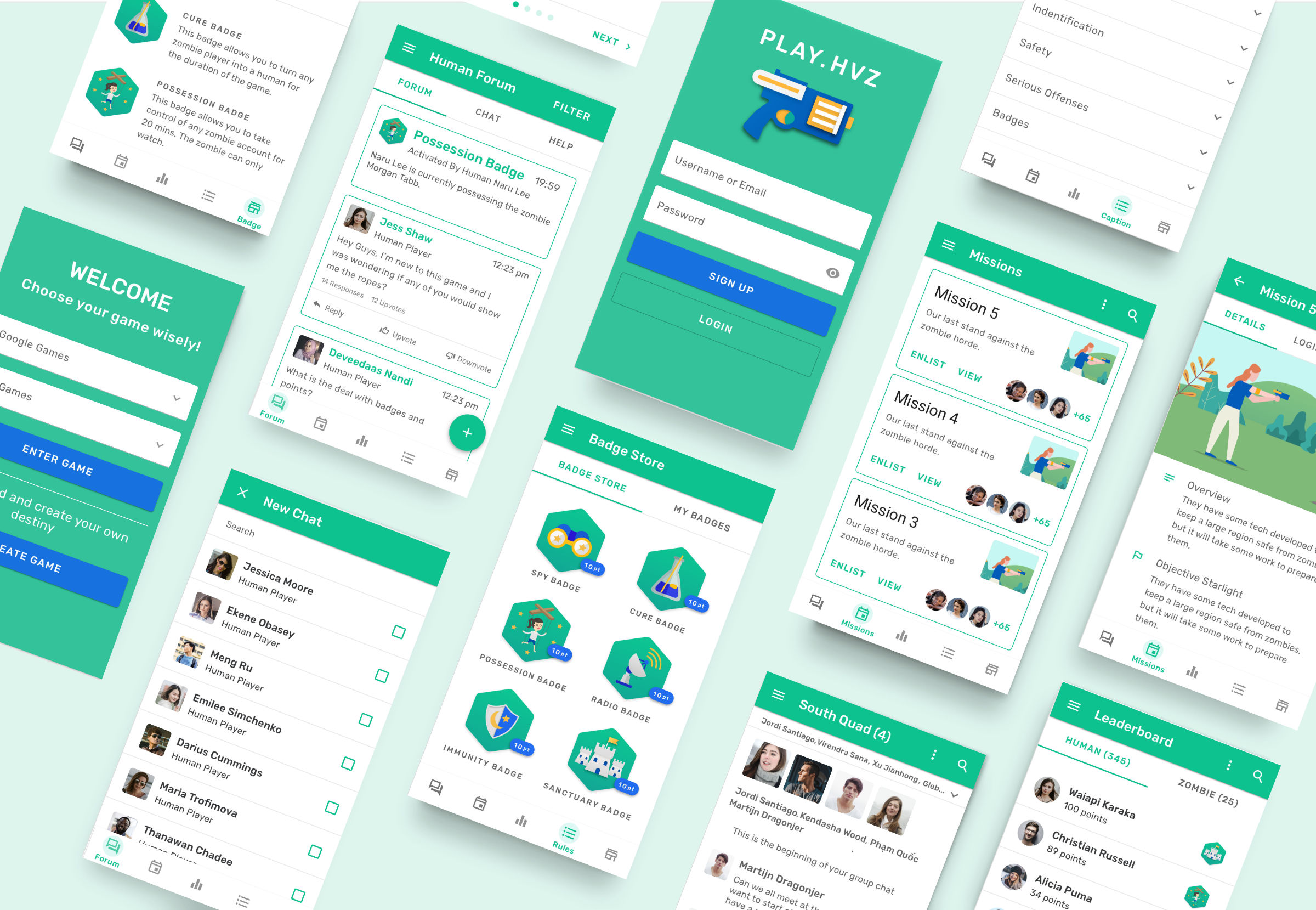 I was inspired by the bold, toy-like colors of the nerf gun and the cool colors of the parkland environment human vs zombies is often played in. I followed Material Design guidelines religiously to implement the UI. I designed all of the illustrations to increase delight and to add a unique flare. The player side of the app is separated into two sections, a zombie side and a human side. When a human is infected in the game and they are "turned into a zombie" the app transforms from a light ui to a dark ui to reflect the infection.