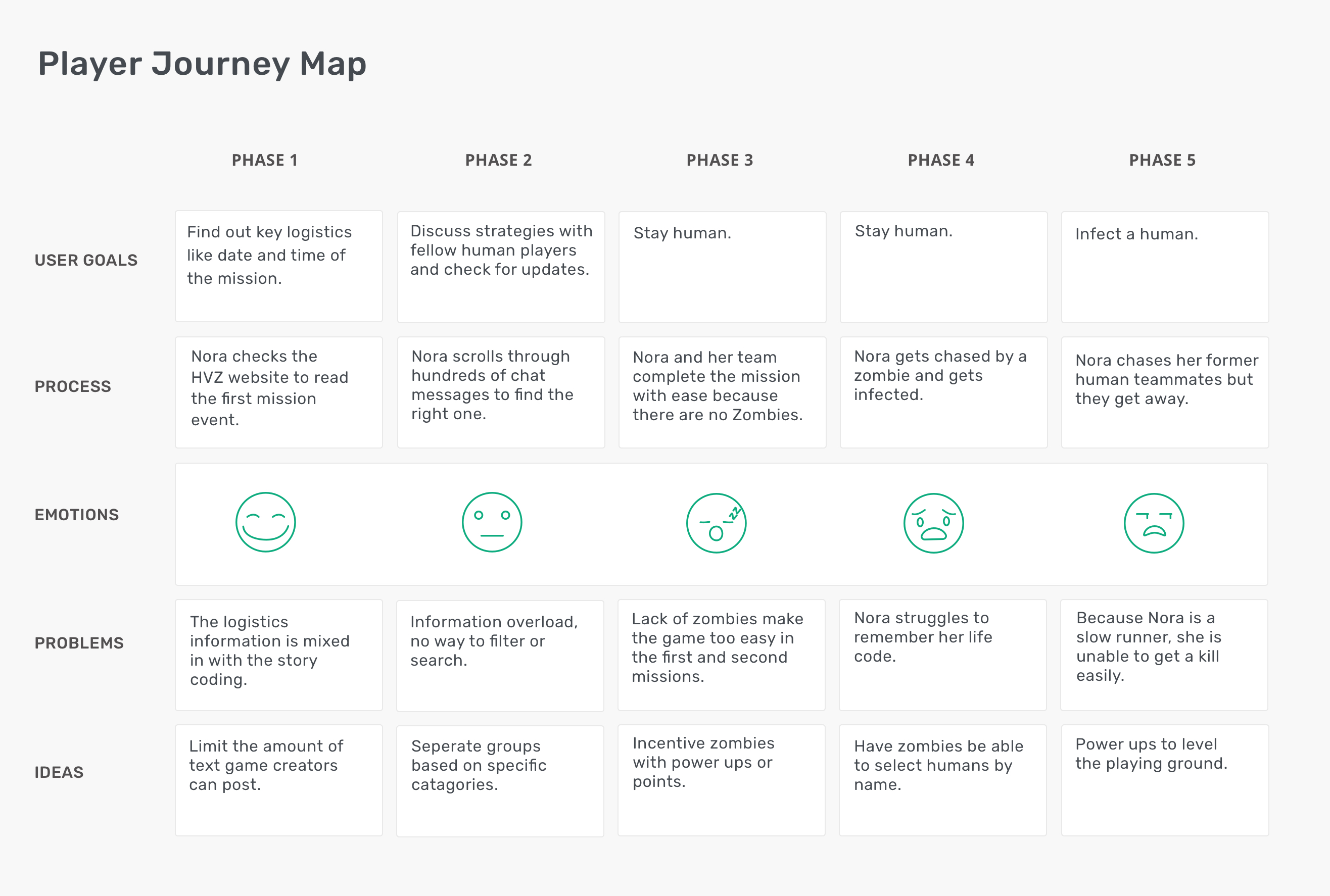 I created two personas and journey map to represent my research findings and illustrate a typical player’s journey through the mixed reality of human vs zombies.