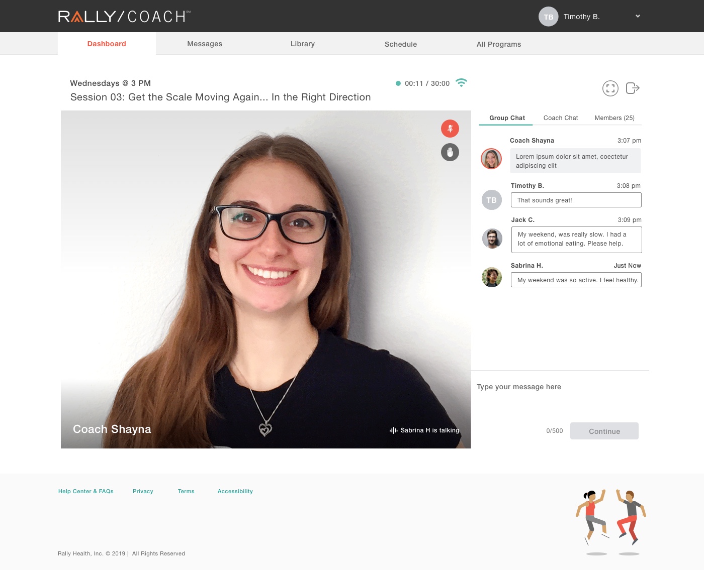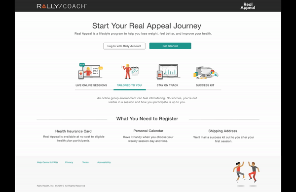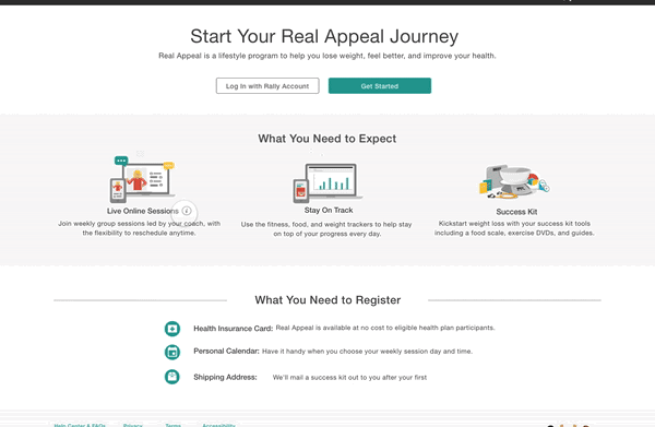 Real Appeal is a 52-week behavior-based weight loss program that is offered by employers to their employees for free. It is a product offered by Rally Health. Real Appeal has members attend weekly coaching sessions. These sessions consist of a live video lecture where the coach interacts with users via chat. When a user signs up for Real Appeal, they go through a registration process that doubles as a health assessment. The product landing page is the first screen in the registration flow. The main purpose of this screen is to educate the user about the Real Appeal product and prepare them for the enrollment process.